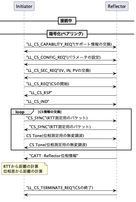 BLE Channel Sounding(以下CS)では、測定を開始する方をInitiatorと呼び、測る対象の方をReflectorと呼びます。特に、Central/Peripheralとは関係ありません。ただ、運用上は、Peripheralを低消費電力にしたいので、CentralがInitiatorになり、PeripheralがReflectorになるケースが多いと思われます。