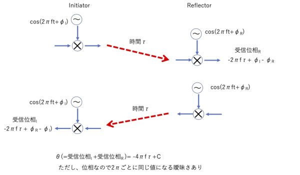 それぞれの受信位相を足し合わせる(通常は位相はIQの複素数で表せるため、その場合は掛け算となる)と、-4πfτ+Cとなり、それぞれでの初期位相が綺麗に消えることになります。Cは固定位相や測定時の遅延など周波数に依存しない定数となります。この式では、位相なので、2πごとの曖昧さが残ってしまいます。