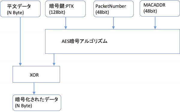 CCMPでは、テンポラリー鍵(以下PTK)とPacketNumber(以下PN。48bit)とMACアドレスを種に、AESのアルゴリズムを動かしています。そのAESのアルゴリズムから暗号系列が出てきますので、それと平文データのXORを取って、暗号化されたデータとしています。